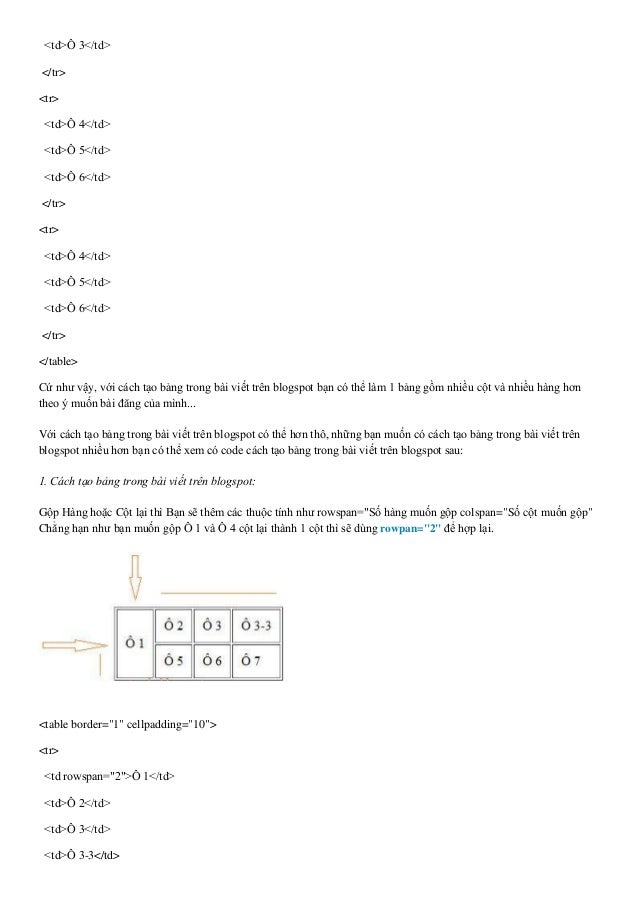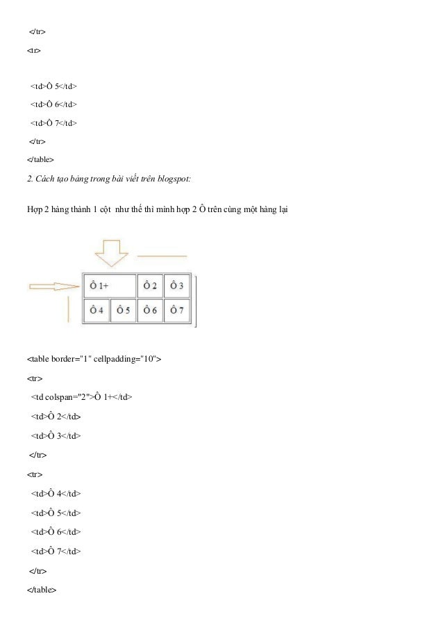 - 3. </tr> <tr> <td>Ô 5</td> <td>Ô 6</td> <td>Ô 7</td> </tr> </table> 2. Cách tạo bảng trong bài viết trên blogspot: Hợp 2 hàng thành 1 cột như thế thì mình hợp 2 Ô trên cùng một hàng lại <table border="1" cellpadding="10"> <tr> <td colspan="2">Ô 1+</td> <td>Ô 2</td> <td>Ô 3</td> </tr> <tr> <td>Ô 4</td> <td>Ô 5</td> <td>Ô 6</td> <td>Ô 7</td> </tr> </table>