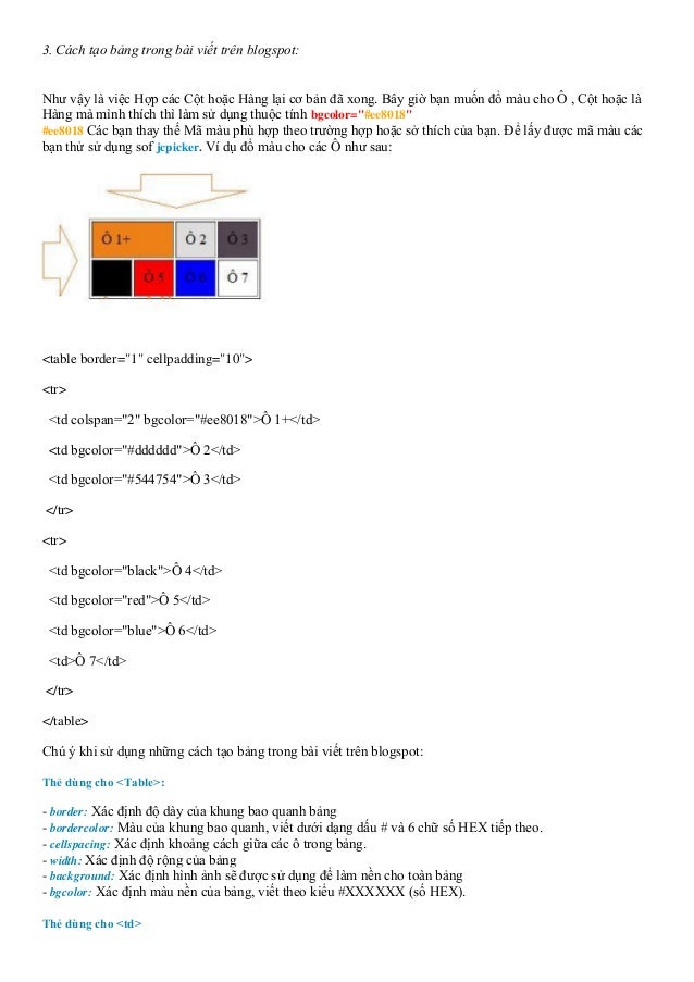 - 4. 3. Cách tạo bảng trong bài viết trên blogspot: Như vậy là việc Hợp các Cột hoặc Hàng lại cơ bản đã xong. Bây giờ bạn muốn đổ màu cho Ô , Cột hoặc là Hàng mà mình thích thì làm sử dụng thuộc tính bgcolor="#ee8018" #ee8018 Các bạn thay thế Mã màu phù hợp theo trường hợp hoặc sở thích của bạn. Để lấy được mã màu các bạn thử sử dụng sof jcpicker. Ví dụ đổ màu cho các Ô như sau: <table border="1" cellpadding="10"> <tr> <td colspan="2" bgcolor="#ee8018">Ô 1+</td> <td bgcolor="#dddddd">Ô 2</td> <td bgcolor="#544754">Ô 3</td> </tr> <tr> <td bgcolor="black">Ô 4</td> <td bgcolor="red">Ô 5</td> <td bgcolor="blue">Ô 6</td> <td>Ô 7</td> </tr> </table> Chú ý khi sử dụng những cách tạo bảng trong bài viết trên blogspot: Thẻ dùng cho <Table>: - border: Xác định độ dày của khung bao quanh bảng - bordercolor: Màu của khung bao quanh, viết dưới dạng dấu # và 6 chữ số HEX tiếp theo. - cellspacing: Xác định khoảng cách giữa các ô trong bảng. - width: Xác định độ rộng của bảng - background: Xác định hình ảnh sẽ được sử dụng để làm nền cho toàn bảng - bgcolor: Xác định màu nền của bảng, viết theo kiểu #XXXXXX (số HEX). Thẻ dùng cho <td>
